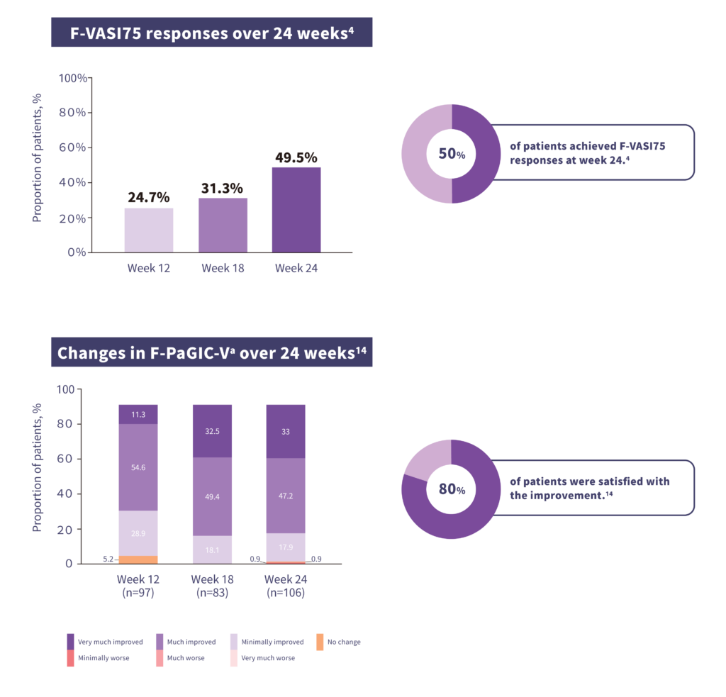 Ruxolitinib cream achieved F-VASI75 responses in 50% of patients at Week 24,4 and 80% of patients were satisfied with the improvement14