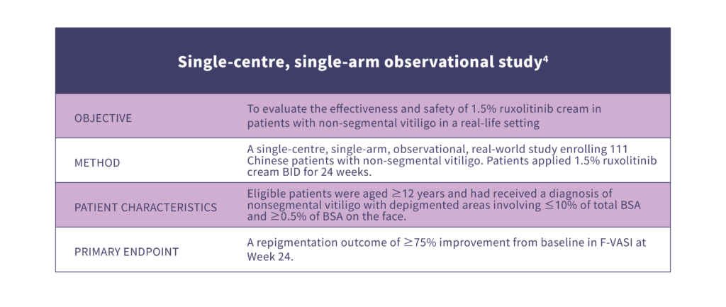 4. Huang H, et al. Effectiveness and safety of ruxolitinib cream in Chinese patients with nonsegmental vitiligo. J Am Acad Dermatol 2025;93(2):475–477.